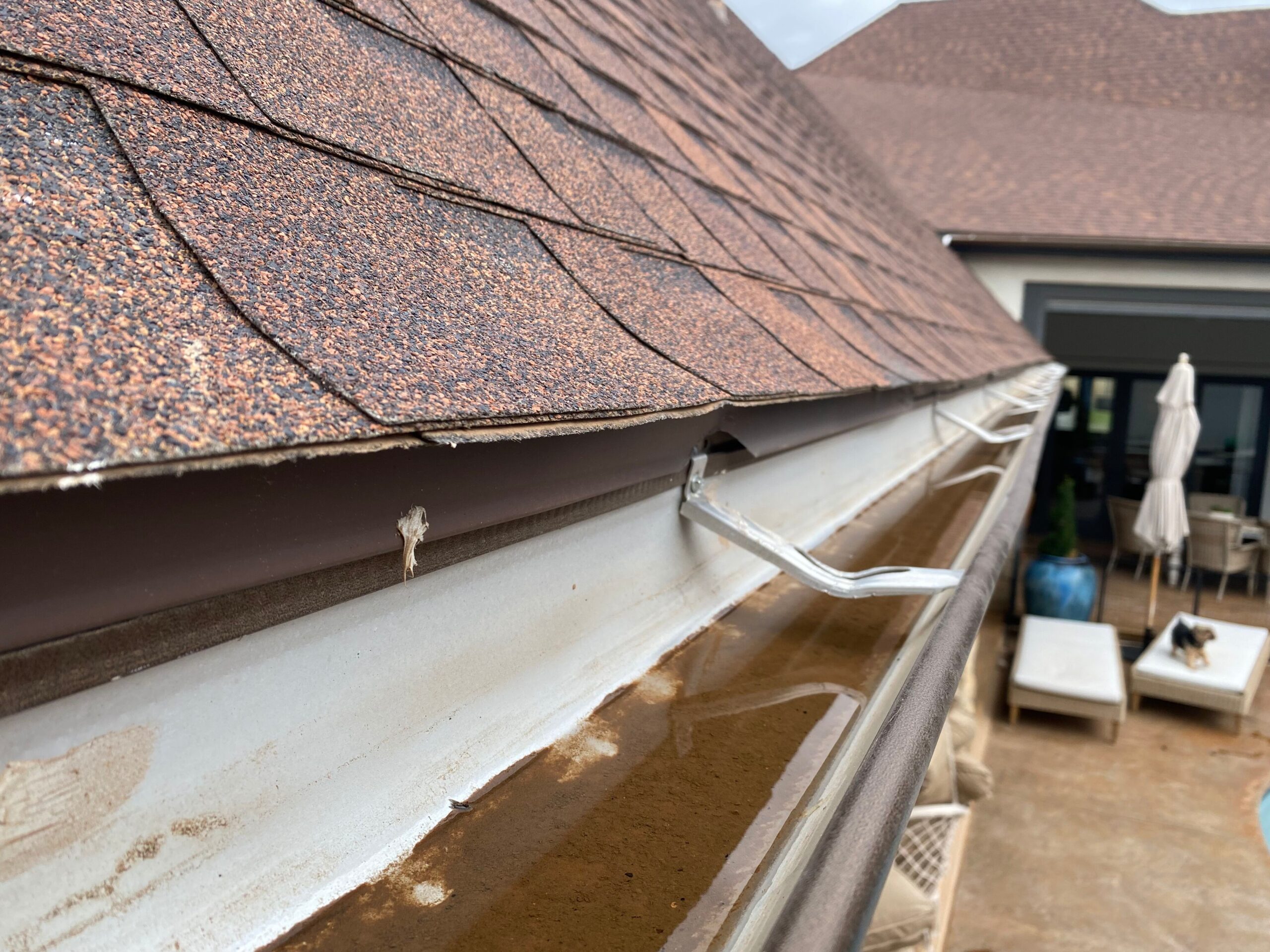 - Clogged gutters caused by leaves, debris, and dirt that block proper water flow